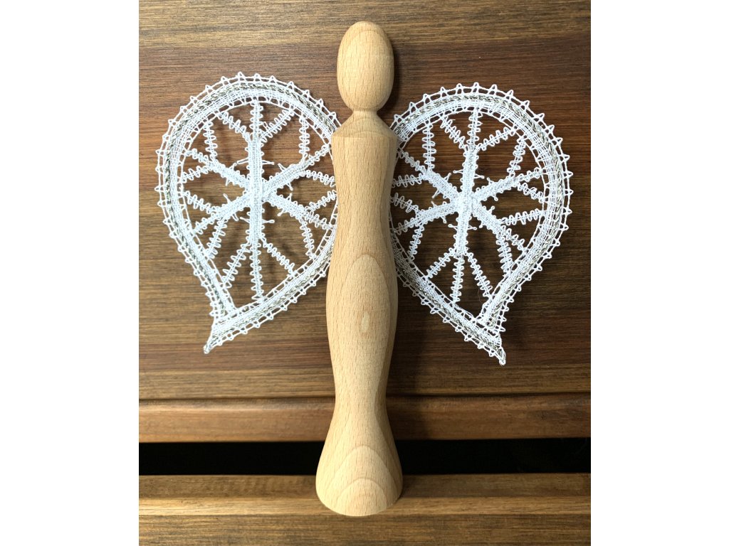 Ručně vyrobená dřevěná andělka s křídly zdobenými sněhovou vločkou