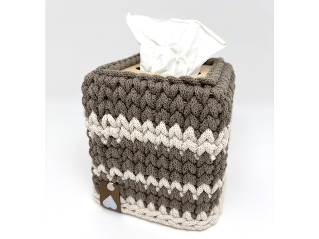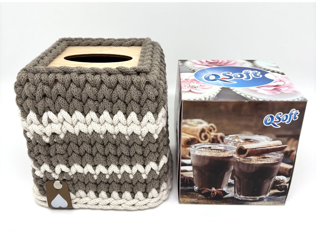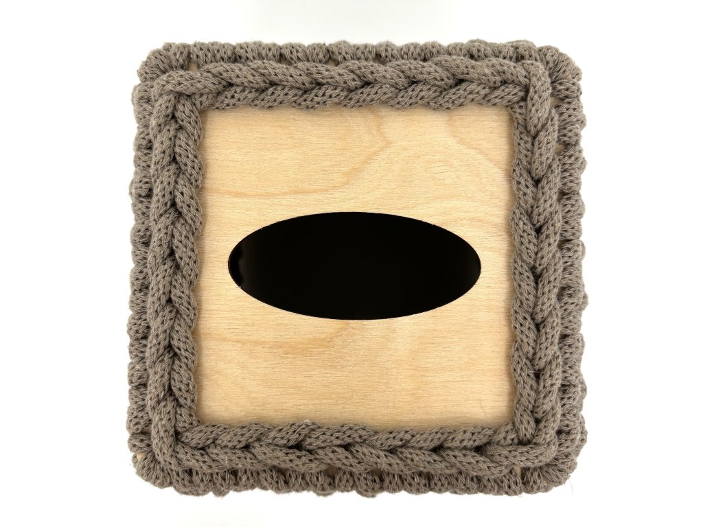 - Kombinace dřeva a příze: Box se skládá z pevného dřevěného víka a ručně háčkovaných stěn. Tato kombinace působí útulně a nadčasově.
