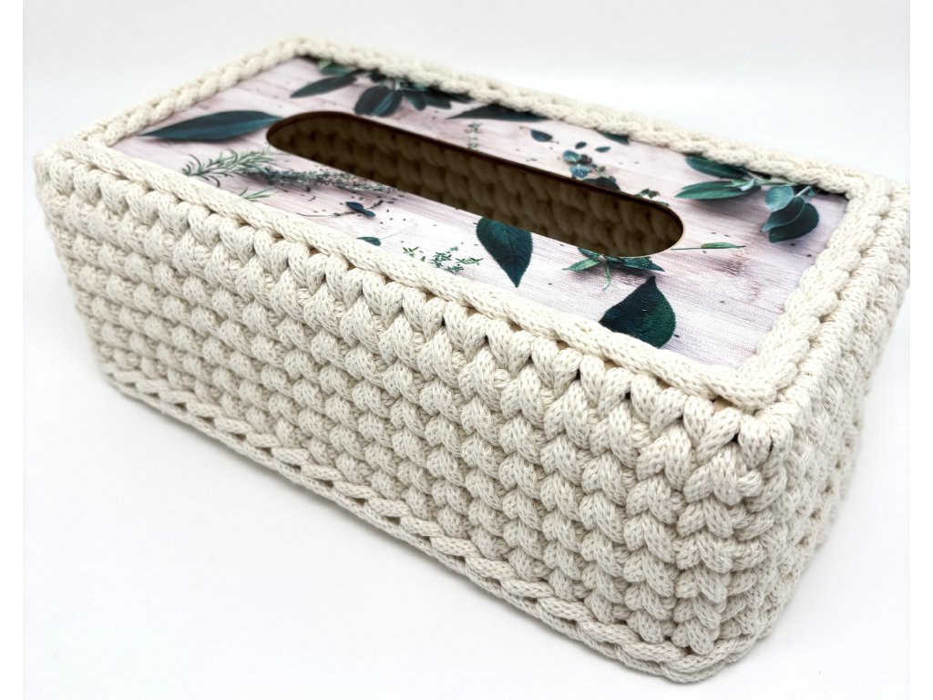 - Kombinace dřeva a příze: Box se skládá z pevného dřevěného víka a ručně háčkovaných stěn. Tato kombinace působí útulně a nadčasově.