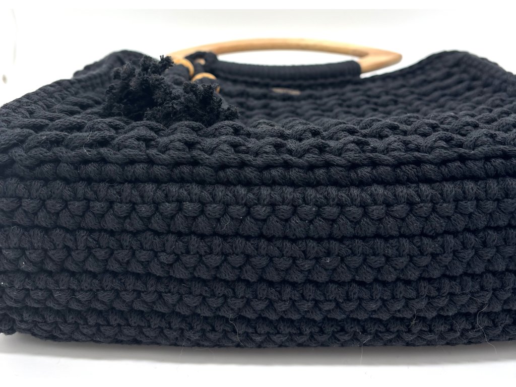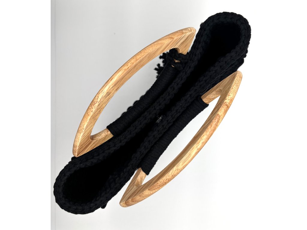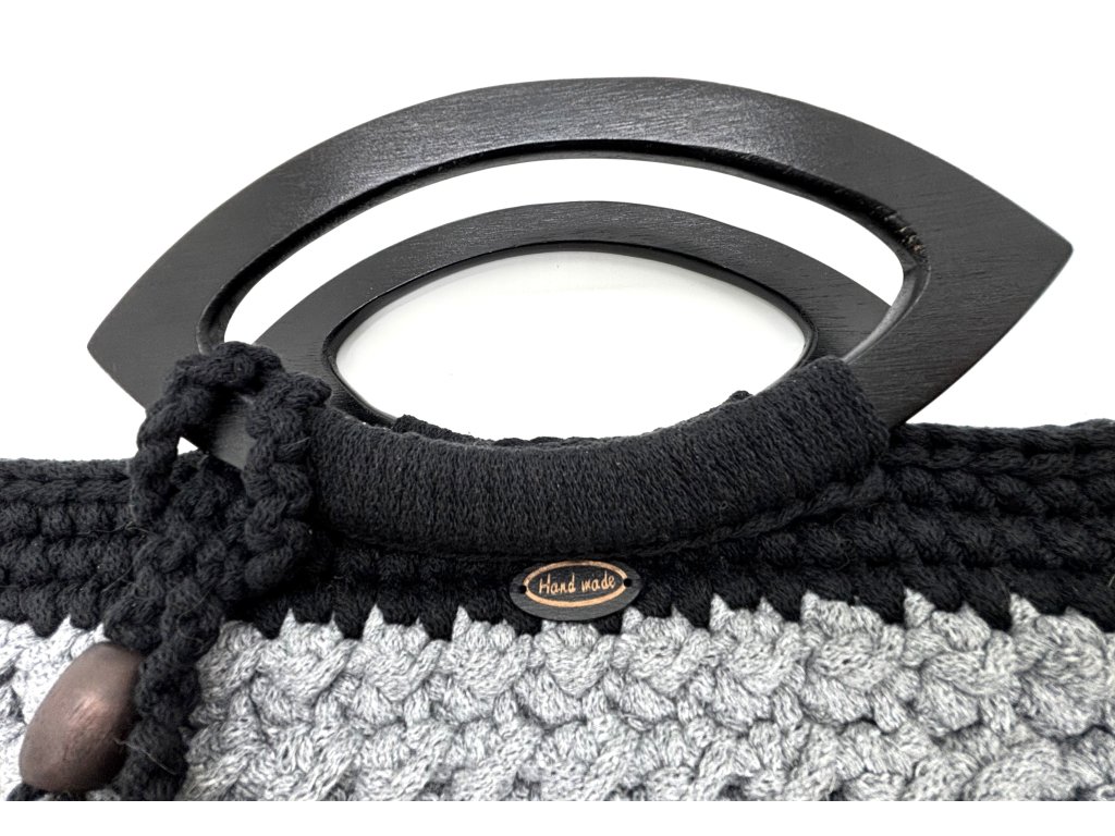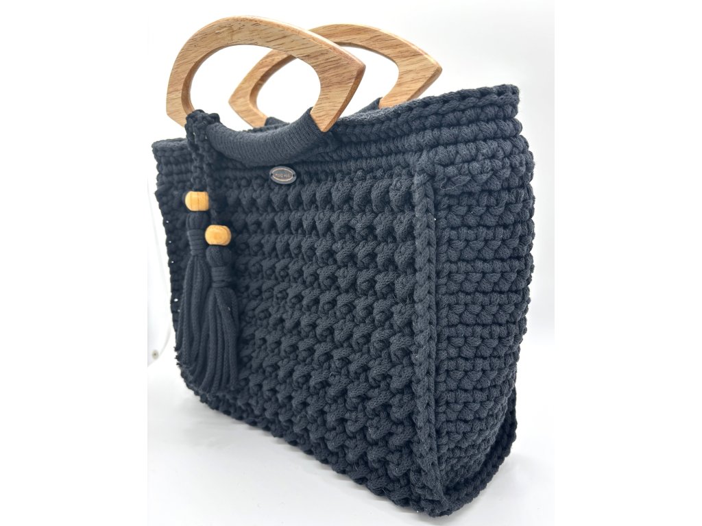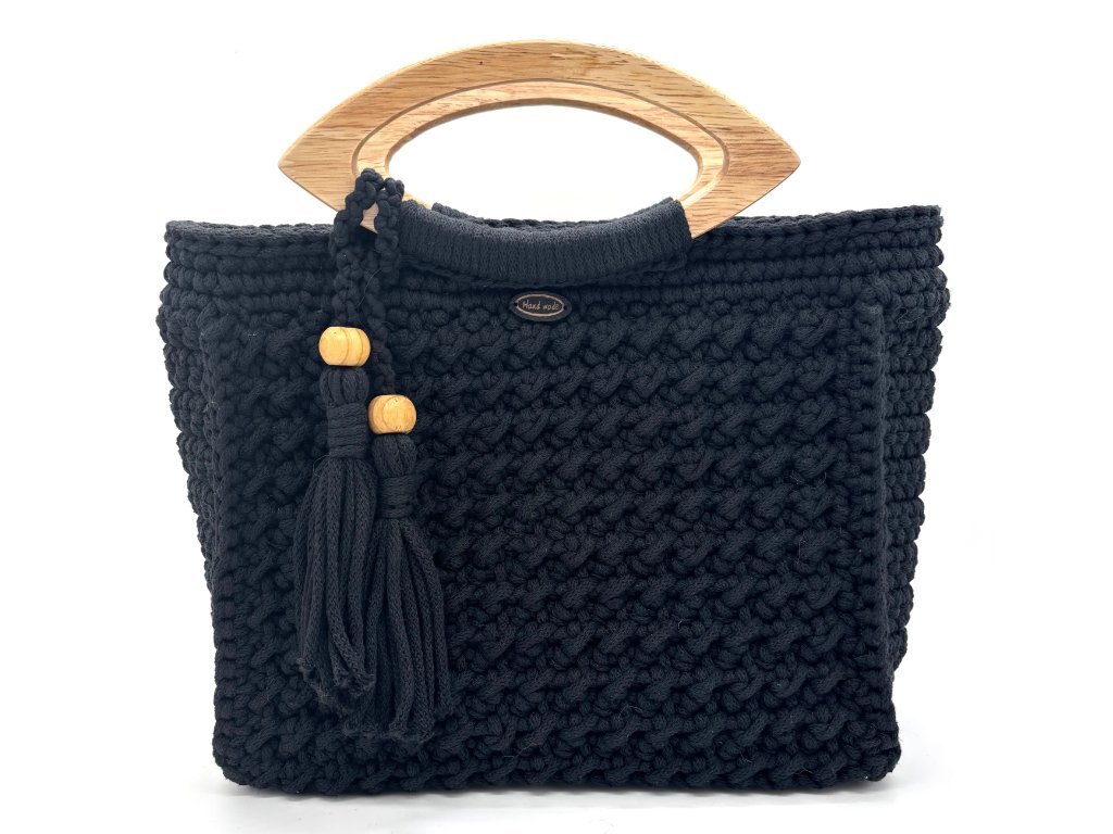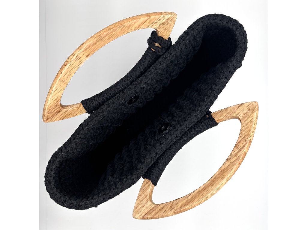 Kabelka Okula je rozměrná háčkovaná taška do ruky s efektními dřevěnými uchy ve tvaru oka. Přední a zadní část je háčkovaná vzorem, který vytváří zajímavý efekt, a kabelku doplňují odnímatelné střapce. Díky své velikosti se do ní vejde vše potřebné, přitom zůstává stylová a dekorativní – ideální jako praktický a hravý doplněk pro každodenní nošení.