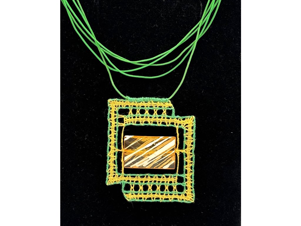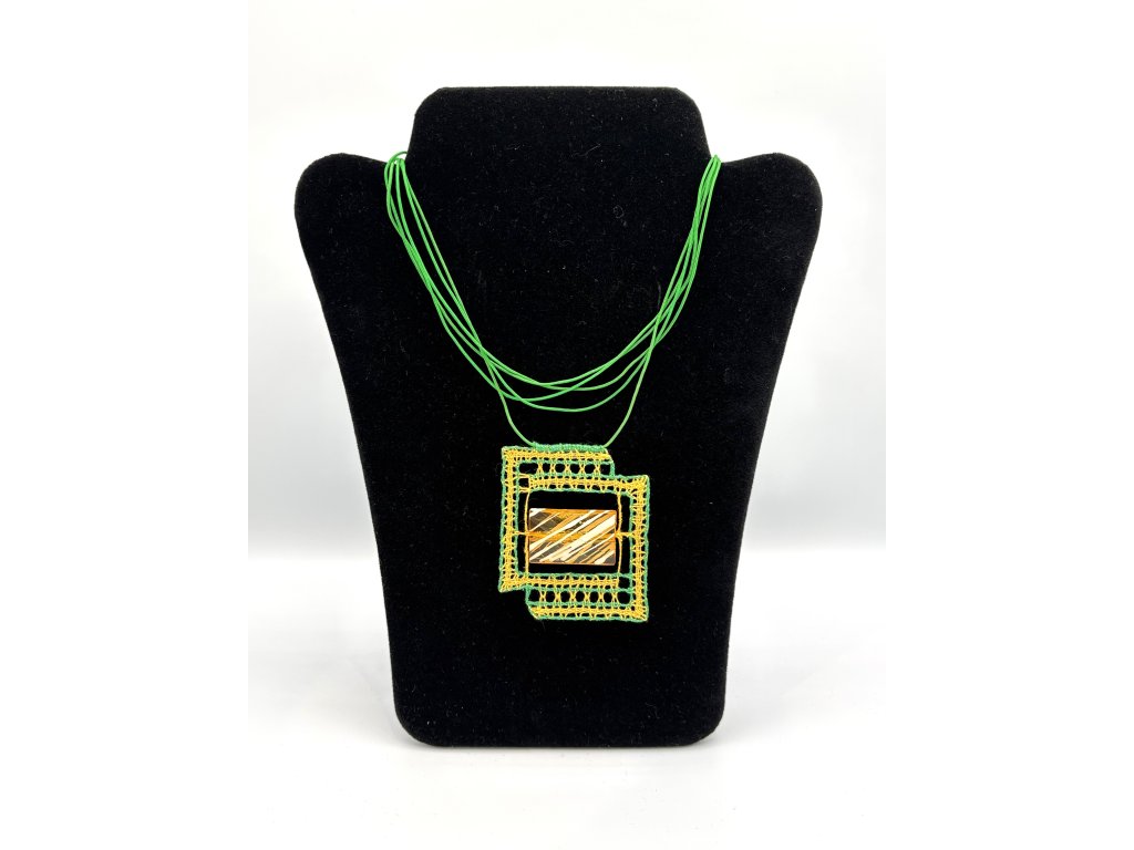 Sluncem prozářený kámen zasazený do zelenožluté krajky připomíná setkání země a světla. Náhrdelník spojuje přírodní barvy s tradiční ruční prací v moderním pojetí.