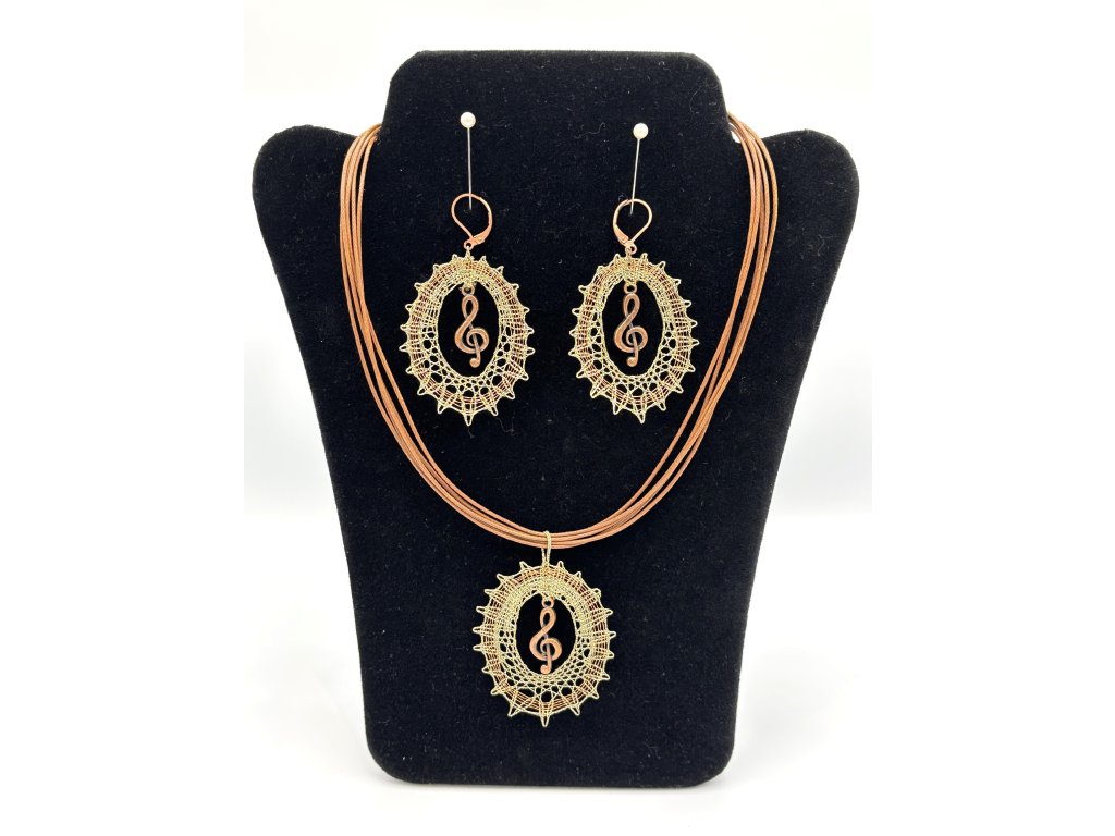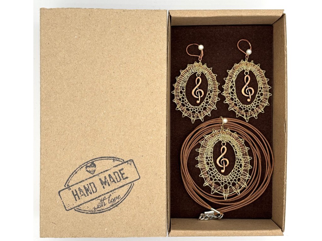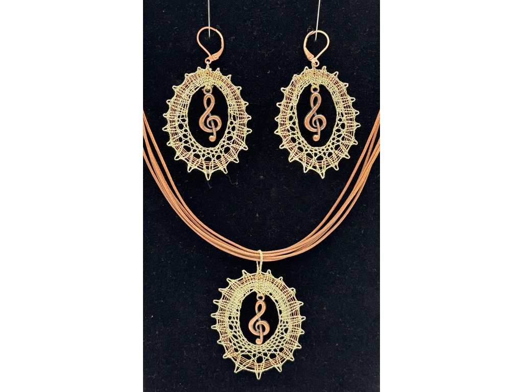 Melodie – Houslový klíč uprostřed doplňuje jemná paličkovaná krajka, která působí jako vizuální rytmus a harmonie. Náhrdelník a náušnice spojují hudební symboliku s tradiční ruční prací, vytvářejí nadčasový šperk plný elegance a lehkosti.