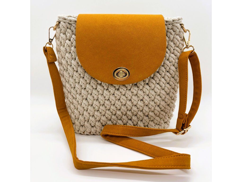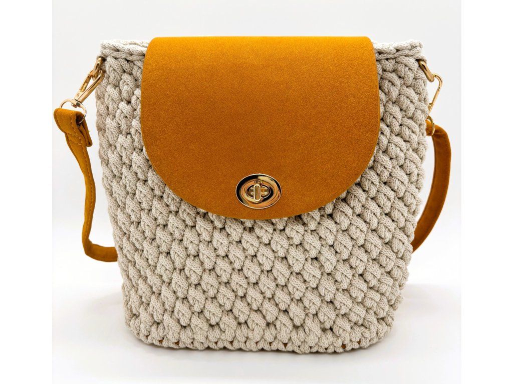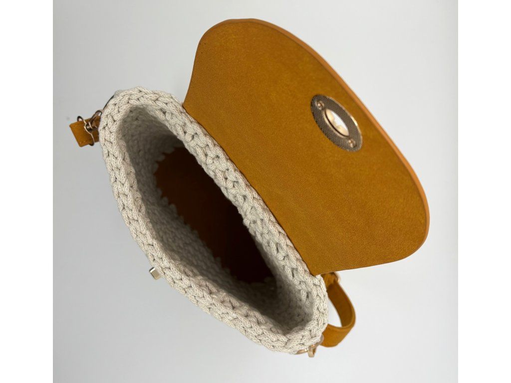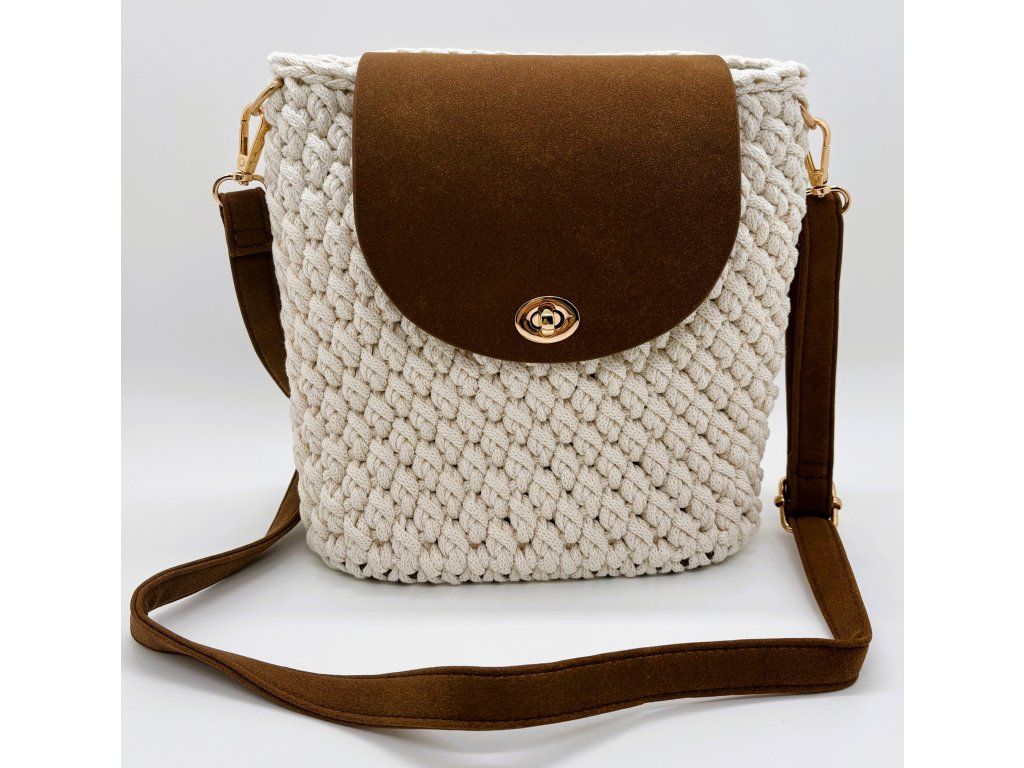 Kabelka Segmenta s půlkruhovou klopou je středně velká háčkovaná kabelka s čistým, geometrickým tvarem. Přibližně čtvercová silueta je doplněná kontrastním dnem, klopou a popruhem z koženky, které kabelce dodávají strukturu a výrazný, moderní charakter. Klopa chrání obsah kabelky a zároveň vytváří zajímavé členění celku.