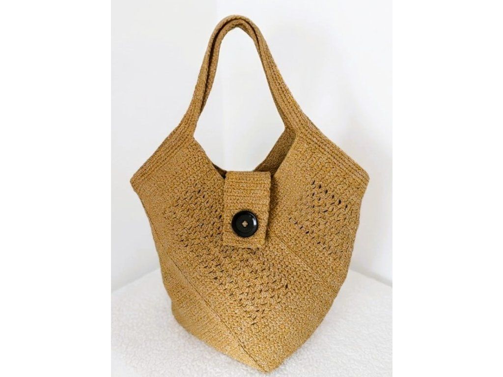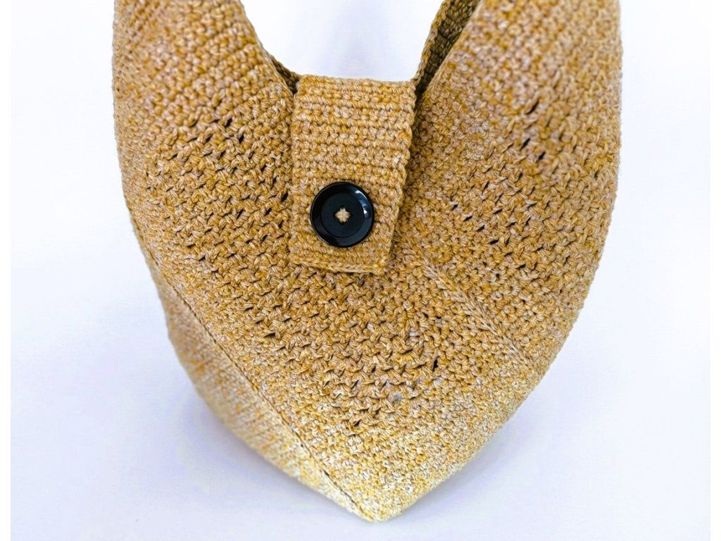 Zapínání je řešeno pomocí výrazného knoflíku, který je nejen praktickým prvkem, ale zároveň podtrhuje osobitý charakter tašky. Čistá geometrie a ruční zpracování z ní dělají výrazný, a přitom lehký doplněk pro letní dny.